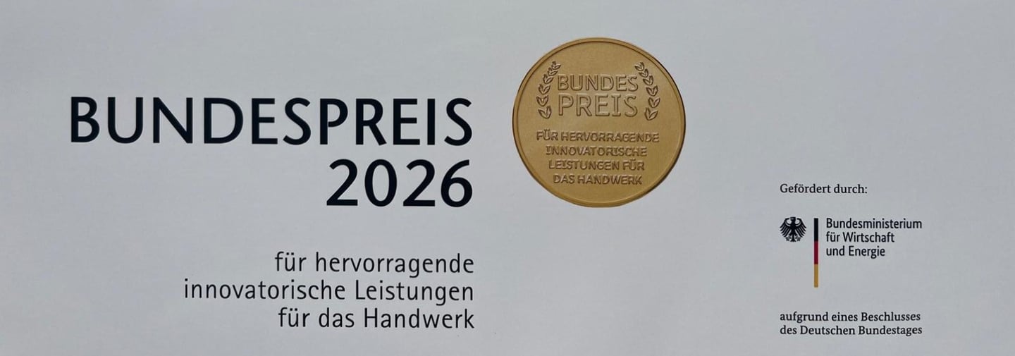 Ein besonderer Meilenstein für unser Team: Im März 2026 wurden wir auf der Internationalen Handwerksmesse in München mit einem Bundespreis für innovative Handwerkstechnologie ausgezeichnet.